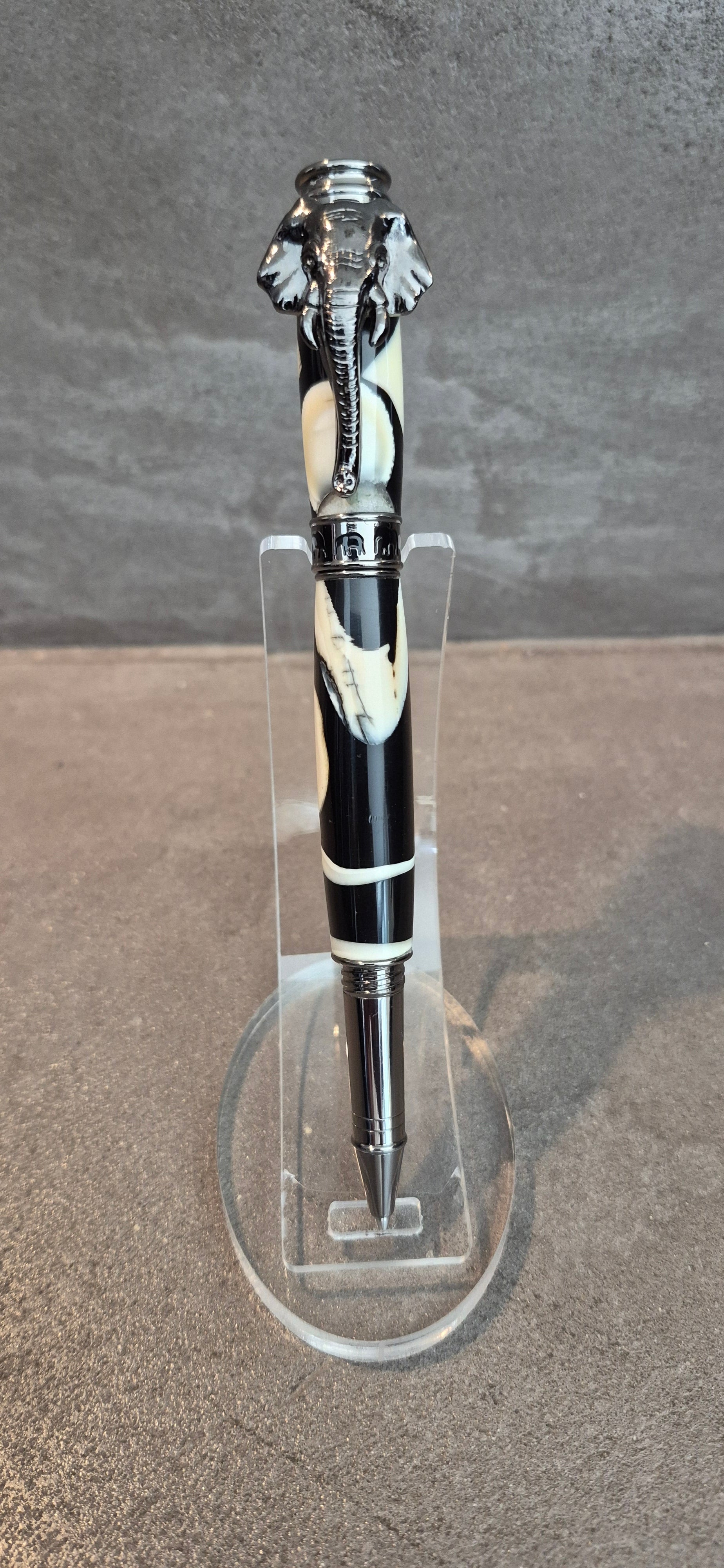Stylo thème éléphant corps en résine avec inclusion défense de phacochère réalisé de façon artisanale, tourné et assemblé à la main dans mon atelier en Moselle. Eléphant couleur noir fera une énorme impression et portera probablement chance au destinataire ! La tête majestueuse d'un éléphant orne le dessus avec le tronc formant le clip. La bande centrale présente une famille d'éléphants marchant autour du périmètre. Recharge type Parker possibilité de la remplacer. Livré dans un joli coffret à tiroir en carton noir avec couvercle coulissant OFFERT